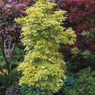 Dogwood ‘Summer Gold’ is a standout Kousa dogwood cultivar prized for its bright golden-variegated foliage and refined ornamental appeal. In late spring to early summer, creamy white bracts emerge above the foliage, creating a soft, elegant floral display. The leaves feature vivid golden-yellow margins surrounding rich green centers, providing eye-catching color throughout the growing season. As temperatures cool, the foliage often develops warm pink and red tones, adding additional seasonal interest.