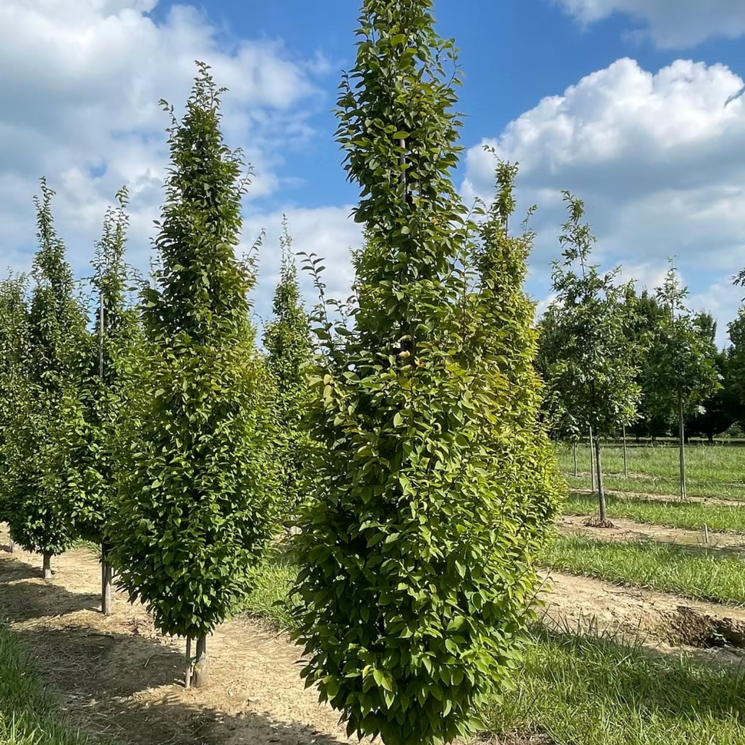 Hornbeam ‘Frans Fontaine’ is a refined columnar selection of European Hornbeam prized for its narrow upright habit and dense, polished foliage. This architectural tree maintains a strong vertical form without heavy pruning, making it ideal for tight spaces, formal plantings, and urban landscapes. Crisp green leaves form a full canopy in summer before turning warm golden tones in fall. Durable, adaptable, and long-lived, Frans Fontaine delivers structure and elegance year-round.