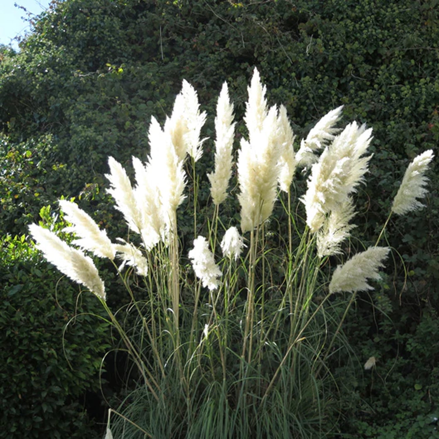 White Pampas Grass (Cortaderia selloana) is a striking ornamental grass prized for its towering height and large, feathery white plumes that create a dramatic statement in the landscape. Blooming from late summer through fall, the showy flower plumes rise high above the arching green foliage, adding texture, movement, and elegance. With its fast growth, drought tolerance, and low maintenance needs, White Pampas Grass is a popular choice for large landscapes, privacy screens, and focal plantings.