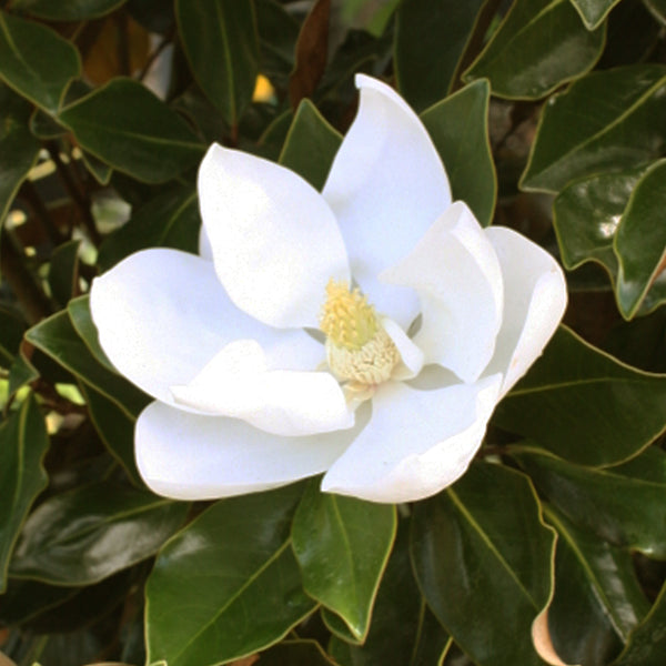 The Southern magnolia is an iconic evergreen tree native to the southeastern United States. It is famous for its large, fragrant white flowers that can reach up to 12 inches in diameter, blooming from late spring to summer. The tree's glossy, dark green leaves have a rust-colored underside, adding to its year-round beauty. Southern magnolias can grow up to 80 feet tall and thrive in USDA Zones 6 to 10. They prefer full sun and well-drained, slightly acidic soil. This majestic tree is often planted as a shade or ornamental specimen, symbolizing strength and grace.